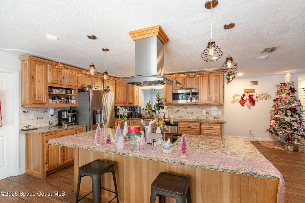 Completely updated 4-bed / 2-bath concrete block home with additional bonus/flex room! Home includes wood-look tile flooring throughout, fully renovated kitchen is featuring stainless steel appliances, granite countertops, abundant cabinetry, a large center island, and stylish modern lighting.Outside, enjoy a fully fenced backyard. Roof (2018) with roof repaired before closing, Septic System (2019), HVAC (2022), Water Heater (2024). Exterior freshly painted and landscaped. Located close to endless shopping and dining options and just five minutes from the beach and 10 minutes from Patrick AFB.