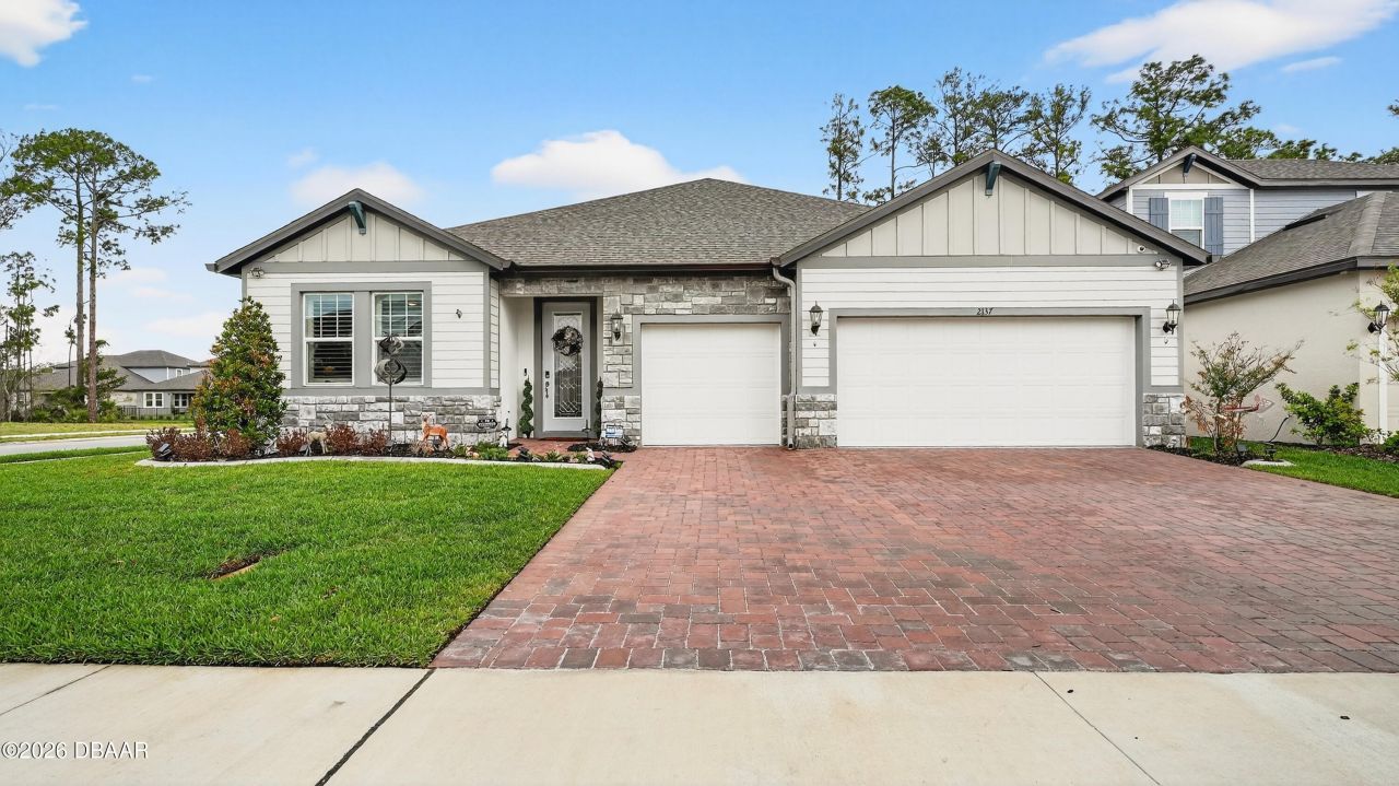 Welcome to 2137 Divot Drive, a stunning Onyx floor plan in the prestigious LPGA International community. This exceptional new construction home features over $150,000 in owner upgrades, making it truly move in ready with designer finishes throughout. Please message me directly for the list of upgrades. The open floor plan showcases a gourmet kitchen with striking dark cabinetry, quartz waterfall island, modern pendant lighting, and stainless steel appliances. Beautiful light wood flooring flows into the spacious living area, complete with a custom built in entertainment center and fireplace, all bathed in natural light from oversized sliding glass doors.The oversized 3 car garage features epoxy flooring and custom storage systems, perfect for the car enthusiast or anyone needing extra space.Located in LPGA International, you'll enjoy resort style amenities, world class golf, and easy access to Daytona Beach, I95, shopping, and dining. This is luxury Florida living at its finest.